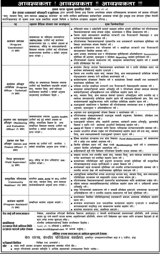 बेस संस्था (व्याकवार्ड सोसाइटी एजुकेशन) द्वारा आगामी दिनमा दाङ जिल्ला अन्तर्गतका समस्त पालिकाहरूमा सञ्चालन गर्न प्रस्ताव गरिएको “मातृ, नवजात शिशु, बाल स्वास्थ्य (MNCH) कार्यक्रम” का लागि तपसिल बमोजिमका कर्मचारीहरू आवश्यक परेको हुँदा इच्छुक तथा योग्यता पुगेका नेपाली नागरिकहरूबाट यो सूचना प्रथम पटक प्रकाशित भएको मितिले ७ दिनभित्र दरखास्त आह्वान गरिन्छ ।